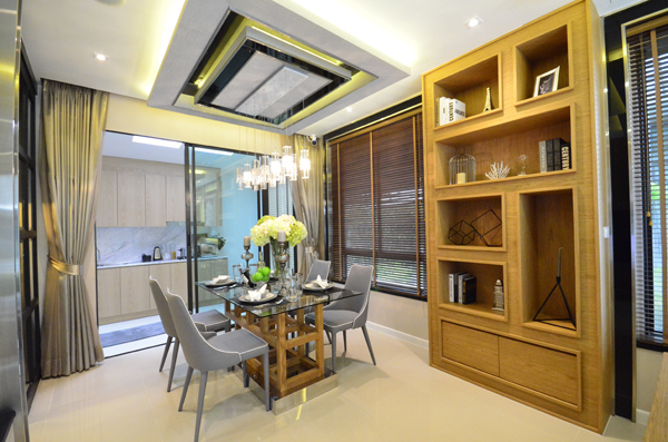 ถัดจากส่วนรับแขกเป็นโต๊ะรับประทานอาหาร พื้นที่ตรงนี้สามารถวางโต๊ะขนาด 4-6 ที่นั่งได้ หน้าต่างที่เห็นมีให้เฉพาะบ้านแปลงมุม ส่วนประตูบานเลื่อนสามารถเปิดออกไปลานซักล้างหลังบ้านได้ค่ะ