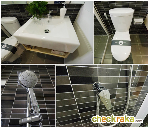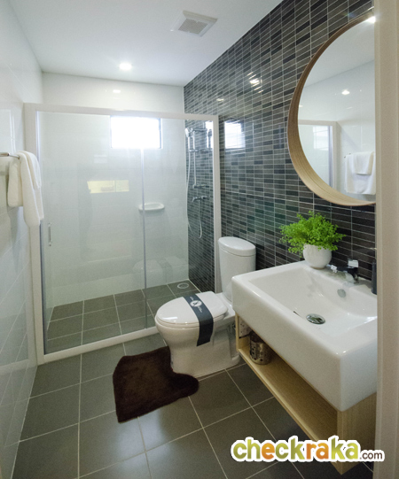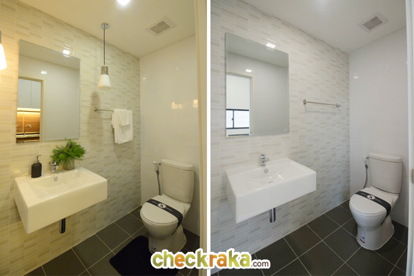 ห้องน้ำของที่นี่ให้สุขภัณฑ์มาครบทั้งโถสุขภัณฑ์ อ่างล้างมือ และกระจก แต่ตัวกระจกสำหรับบ้านเปล่าจะได้