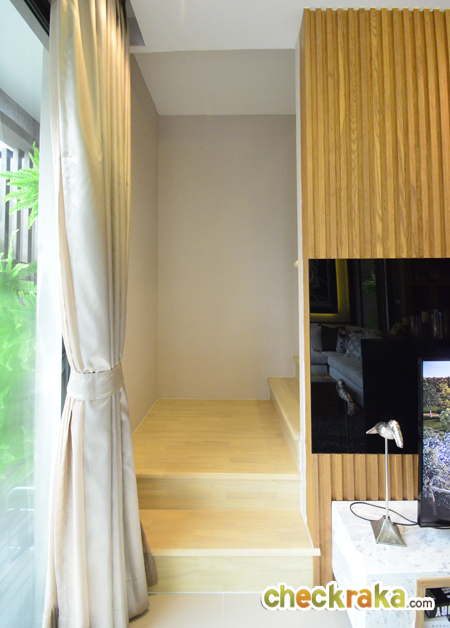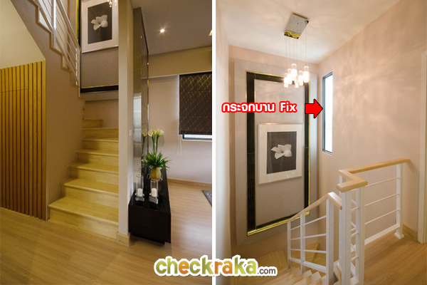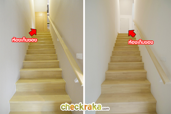 ฝั่งซ้ายคือบันไดบ้านตัวอย่างพร้อมตกแต่ง ฝั่งขวาคือบันไดแบบบ้านเปล่า มองขึ้นไปเห็นประตูห้องเก็บของ