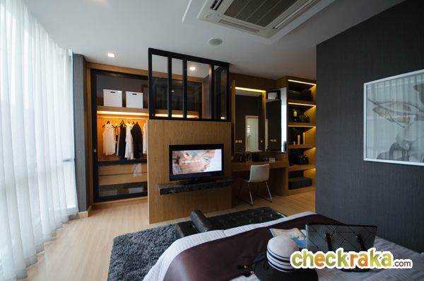 พื้นที่ปลายเตียงสามารถจัดวาง Mini Walk in Closet กั้นผนังเบาสำหรับติดตั้งทีวี และโต๊ะเครื่องแป้ง