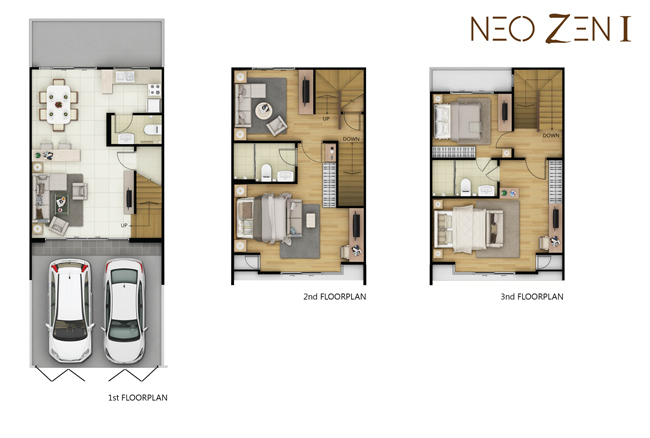 1) ทาวน์โฮม NEO ZEN - ทาวน์โฮม 3 ชั้น หน้ากว้าง 5.5 เมตร ขนาดที่ดินเริ่มต้น 20.5 ตารางวา มีพื้นที่ใช้สอย 150 ตารางเมตร ประกอบไปด้วย 3 ห้องนอน 3 ห้องน้ำ 1 พื้นที่รับแขก ส่วนรับประทานอาหาร 1 ห้องอเนกประสงค์ พื้นที่ครัว จอดรถได้ 2 คัน