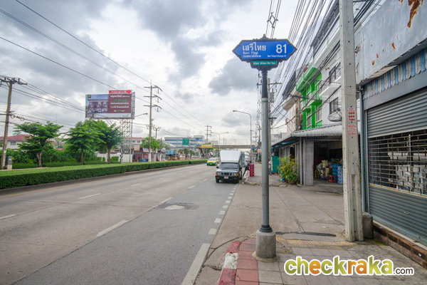 - สภาพแวดล้อมรอบโครงการ - ถนนเสรีไทย ถือเป็นถนนที่ค่อนข้างมีผู้คนใช้ชีวิตอยู่กันอย่างคับคั่งทีเดียวค่ะ เชื่อมกับถนนรามคำแหง ถนนรามอินทรา และถนนสวนสยาม ที่มีสิ่งอำนวยความสะดวกอยู่อย่างรอบด้าน ไม่ว่าจะเป็นห้างสรรพสินค้า อาทิ Fashion Island, The Mall บางกะปิ, Paseo Town จับจ่ายซื้อของสะดวกสบายกับ Big C, Makro, Tesco Lotus, MaxValu โรงพยาบาลสำคัญ อย่างโรงพยาบาลนพรัตนราชธานี, โรงพยาบาลเกษมราษฎร์ และสถานศึกษา อาทิ โรงเรียนเตรียมอุดมศึกษาน้อมเกล้า, มหาวิทยาลัยรามคำแหง เป็นต้น นอกจากนี้สภาพแวดล้อมที่อยู่ใกล้เคียงโครงการก็ถือว่าสะดวกเช่นกันค่ะ ภายในซอยเสรีไทย 81 เป็นถนน 2 เลนรถสวนกันได้สะดวก แต่จะมีบ้านเรือนละแวกนั้นนำรถมาจอดหน้าบ้านบ้าง บ้านเรือนแถวนี้จะเป็นทาวน์โฮม และตึกแถวเสียส่วนใหญ่ จากถนนเสรีไทยยังสามารถไปถนนสวนสยาม ซึ่งจากปากซอยเสรีไทย 81 ไปถนนสวนสยาม มีระยะห่างเพียง 180 เมตรเท่านั้น ถนนสวนสยามนั้น มีร้านอาหาร ร้านค้า เยอะแยะมากมายตลอดทั้งสาย ทั้งร้านก๋วยเตี๋ยว, ร้านข้าวมันไก่ หรือจะเป็นร้านนั่งเล่นชิลๆ ก็มีเช่นกันค่ะ