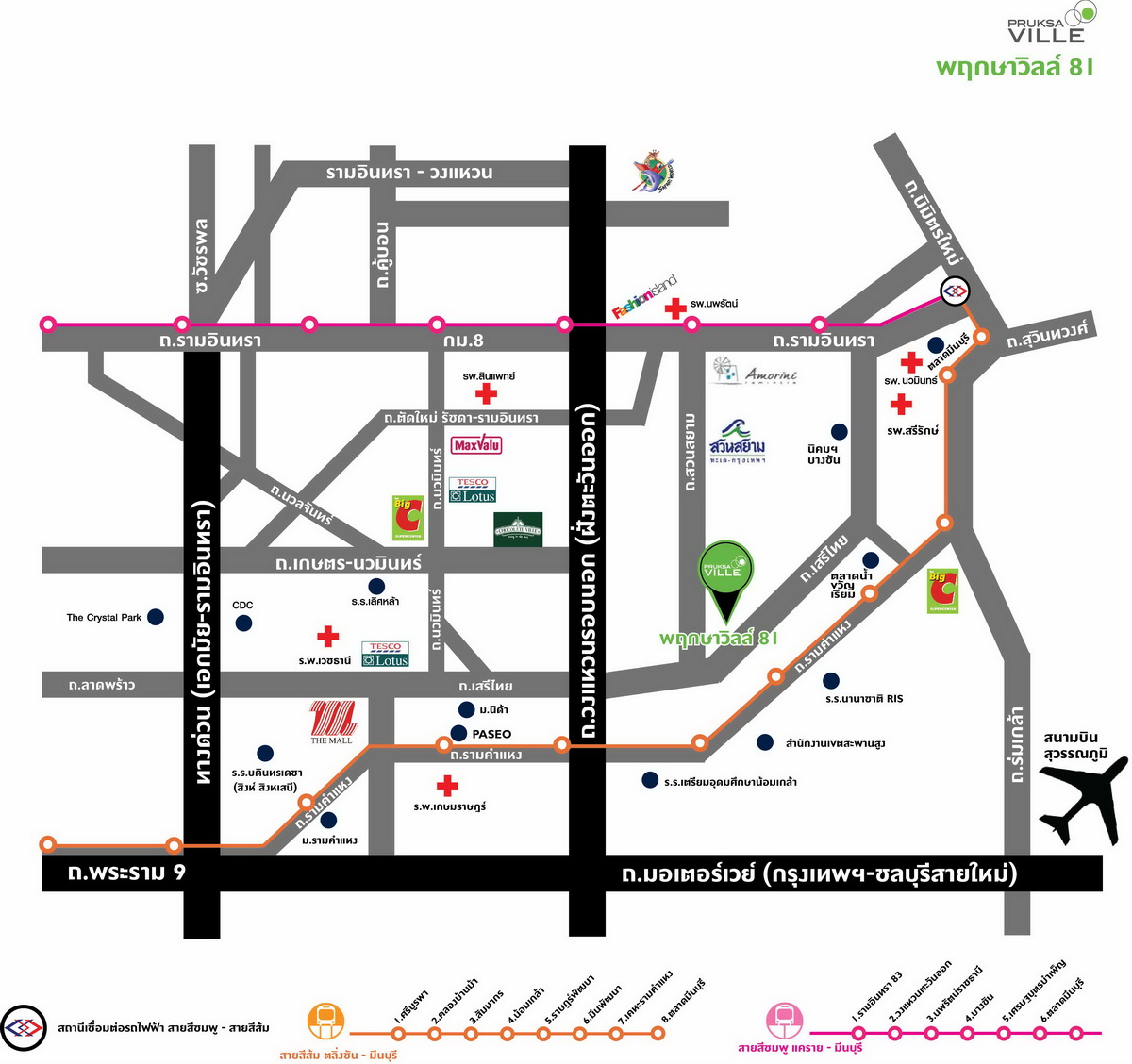 แผนที่แสดงระยะทางจากโครงการมายังรถไฟฟ้าสายสีชมพู และสายสีส้ม (