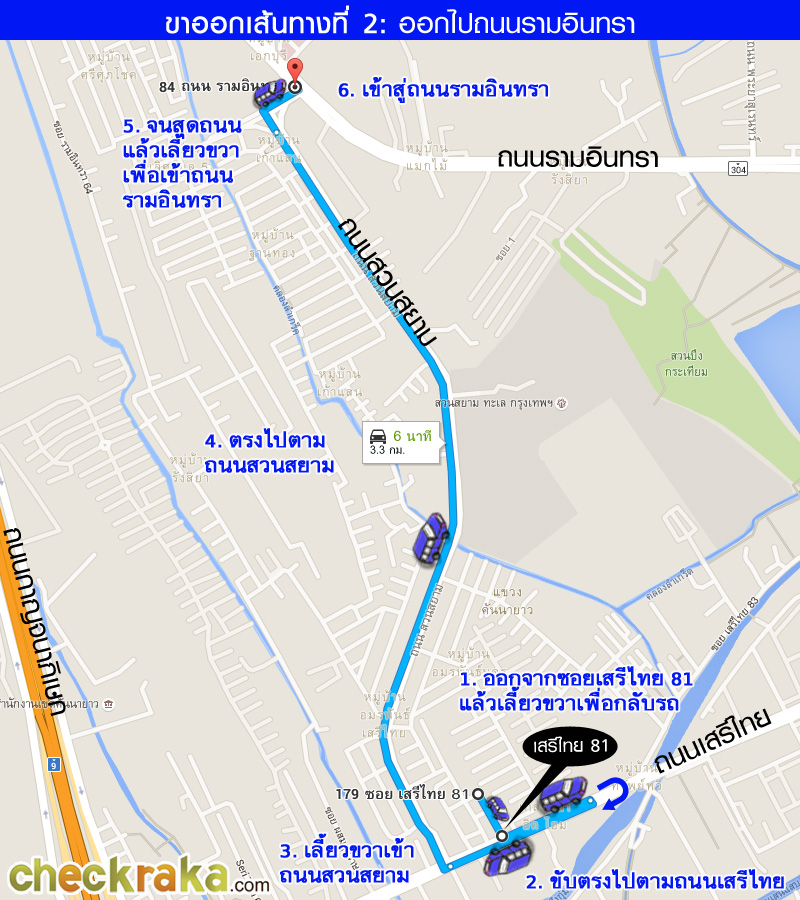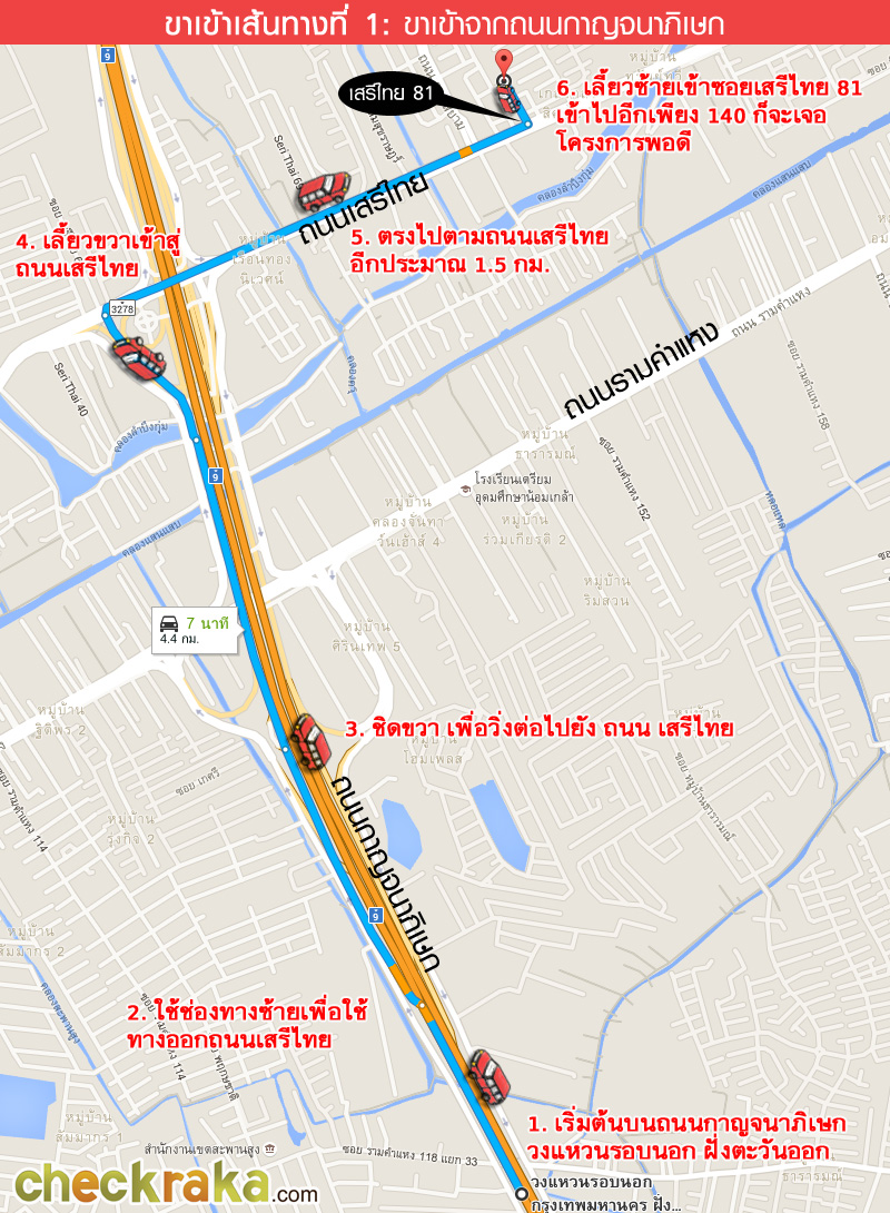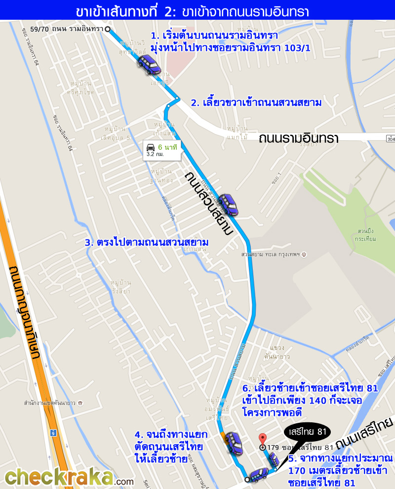 จากทางแยกสวนสยามมาประมาณ 1.5 กม. เจอซอยเสรีไทย 81 เลี้ยวซ้ายเข้าไปได้เลยค่ะ