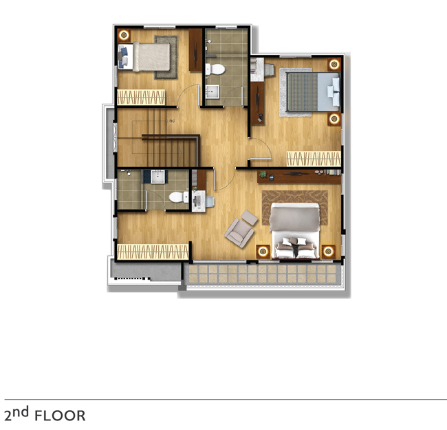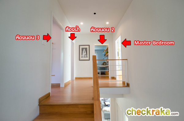ถัดจากนั้นเป็นห้องนอน 2 และฝั่งขวาสุดคือ Master Bedroom พื้นชั้น 2 เป็นพื้นลามิเนต