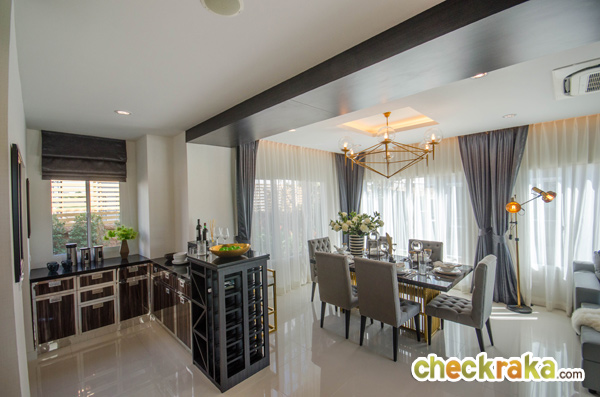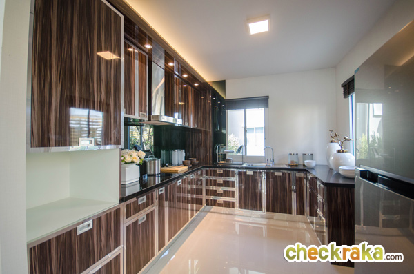 บ้านตัวอย่างจะตกแต่งครัวมาให้เต็มพื้นที่ สำหรับห้องครัวบ้านที่ส่งมอบลูกค้าจะเป็นห้องเปล่า ไม่มีเคาน์เตอร์