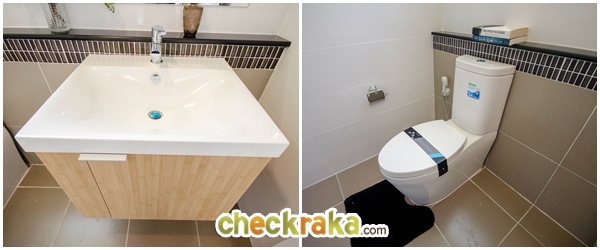 กลับมาดูด้านในบ้านกันต่อ ถัดจากห้องครัวคือทางเข้าห้องน้ำของชั้น 1 จะเห็นว่าพื้นหน้าห้องน้ำลดระดับลง 2 ขั้น