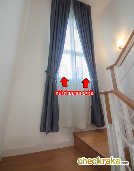 ตรงบันไดมีกระจกรับแสงทรงสูง บานด้านล่างคือบานกระทุ้งเปิดออกระบายอากาศได้