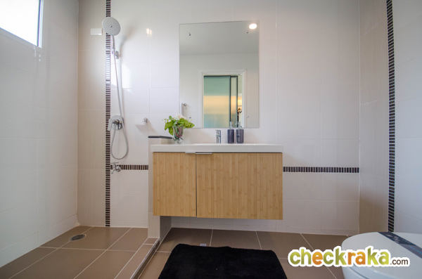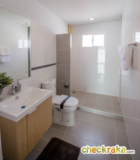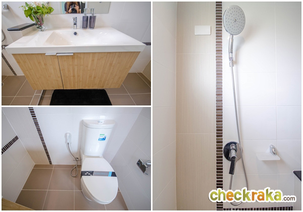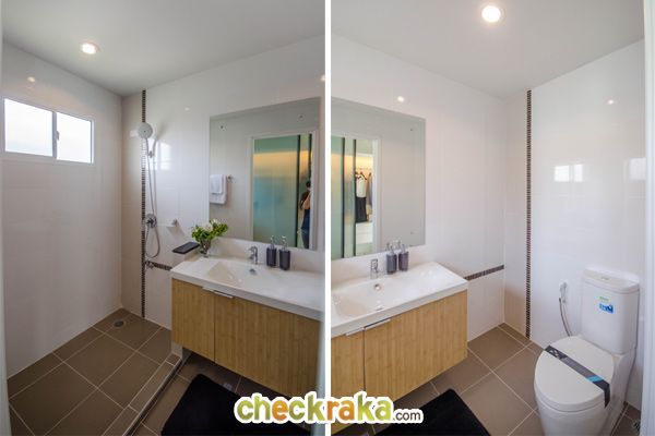 ประตูทางเข้าห้องน้ำจะอยู่ในพื้นที่ Walk in Closet ฟังก์ชั่นห้องน้ำในตัว ฝั่งซ้ายเป็นพื้นที่อาบน้ำ