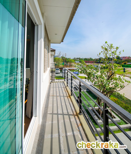 ระเบียงกว้างไม่มากนัก แต่มีความยาวมากพอสมควรเลยค่ะ ราวกันตกเป็นราวเหล็กทาสีดำ