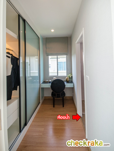 ภายใน Walk in Closet มีหน้าต่างบานเลื่อนให้ 1 บาน และ Built In ตู้เสื้อผ้าแบบเต็มพื้นที่ให้ดูเป็นไอเดีย