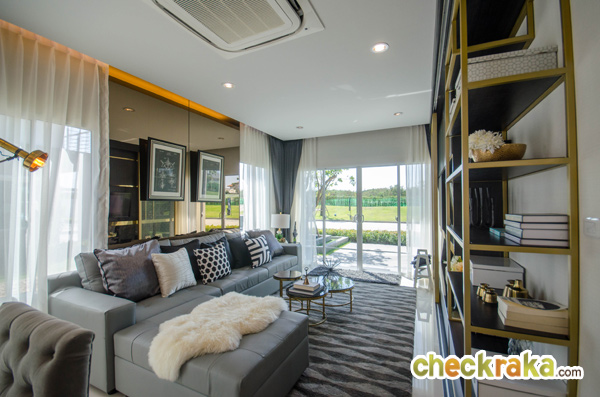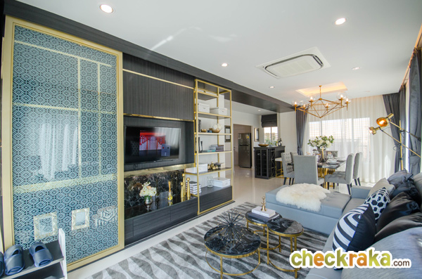 ตรงข้ามโซฟารับแขก คือพื้นที่ที่ใช้จัดวางทีวี ซึ่งทางโครงการ Built-in เป็นชั้นวางของ ตู้โชว์ และมีพื้นที่สำหรับ