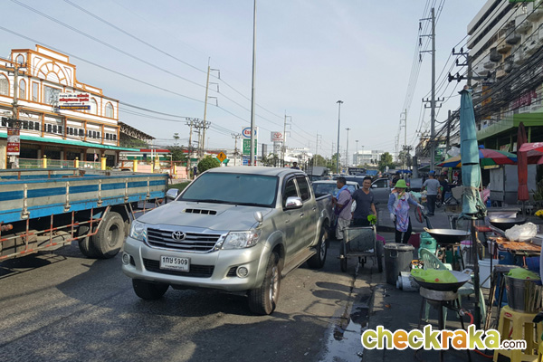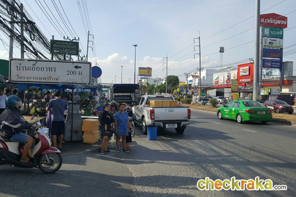 บริเวณถนนเทพารักษ์ด้านหน้าปากซอยของโครงการ ด้านซ้ายมือ มีตลาดและผู้คนอาศัยอยู่เยอะ