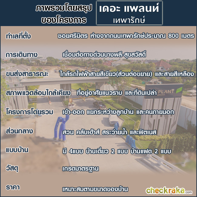 โครงการ เดอะ แพลนท์ เทพารักษ์ (The Plant Thepharak) เป็นโครงการบ้านเดี่ยวและบ้านแฝด 2 ชั้น ตั้งอยู่ซอยศรีมิตร ตำบลเทพารักษ์ อำเภอเมืองสมุทรปราการ จังหวัดสมุทรปราการ เดินทางเข้า-ออกโครงการด้วยเส้นทางหลักถนนเทพารักษ์ มีบ้านทั้งหมด 318 ยูนิต พื้นที่โครงการ 51-3-84.3 ไร่ ถนนหลักทางเข้ากว้าง 21 เมตร จากนั้นกว้าง 16-12 เมตรตามลำดับ ถนนภายในซอยกว้าง 8 เมตร มีรั้วรอบโครงการสูงถึง 3 เมตร ภายในโครงการมีสิ่งอำนวยความสะดวกครบครัน ทั้ง Club house สระว่ายน้ำ ฟิตเนส และสวนสาธารณะขนาด 1.3 ไร่ (สิ่งอำนวยความสะดวกทั้งหมดนี้กำลังอยู่ระหว่างการก่อสร้าง) ตัวถนนหน้าโครงการเป็นถนนสาธารณะประโยชน์ใช้ร่วมกับโครงการอื่นค่ะ