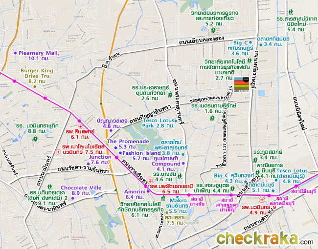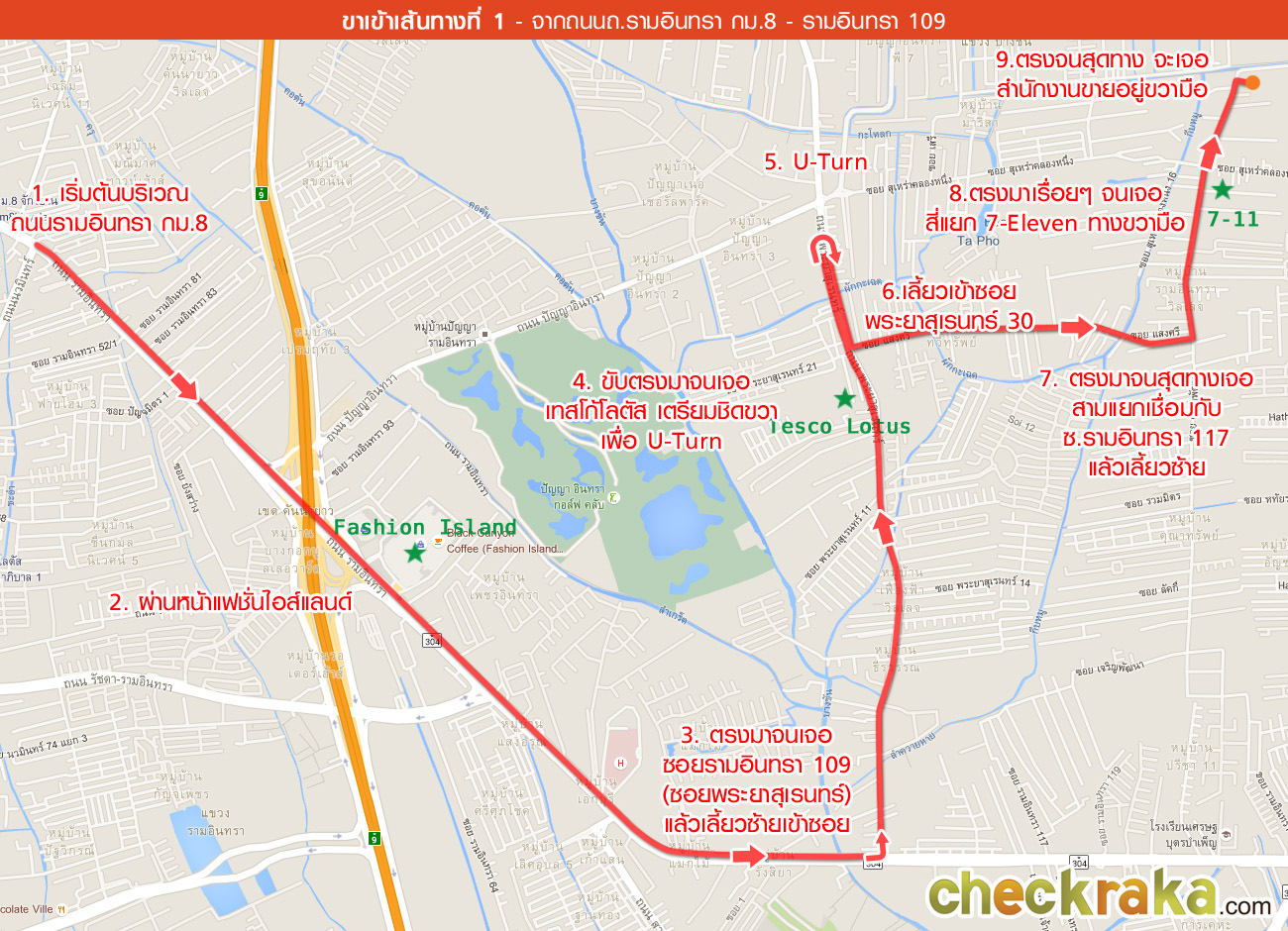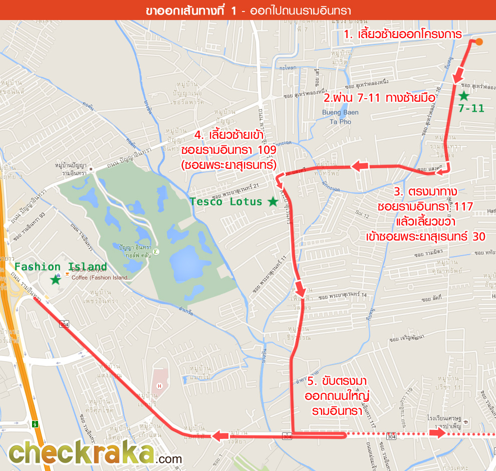 เริ่มต้นบริเวณถนนรามอินทรา ตรงมาเรื่อยๆ จะผ่าน Fashion Island