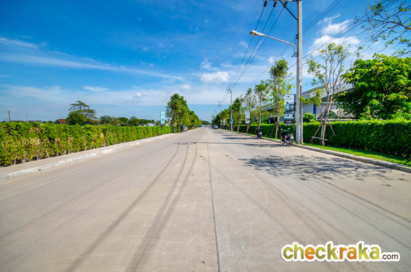 ด้านข้างเป็นแนวรั้วต้นไม้ และต้นไม้สูงเพื่อความร่มรื่น ถนนเมนกว้าง 20 เมตร