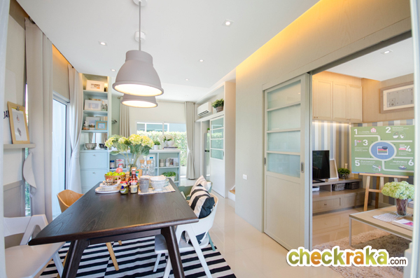 4. แบบบ้านและวัสดุ : ถึงแม้จะเป็นทาวน์โฮม 2 ชั้น แต่ภายในบ้านก็ถือว่ามีการจัดฟังก์ชั่นให้ครบครันเทียบเท่าบ้านเดี่ยวเลยทีเดียว โดยเฉพาะในส่วนของห้องรับแขกที่มีการกั้นพื้นที่เป็นสัดส่วน และห้องอเนกประสงค์ด้านล่างที่สามารถปรับฟังก์ชั่นเป็นห้องนอนชั้นล่างหรือห้องดูทีวีได้ด้วย ส่วนวัสดุถือว่าจัดมาให้ในระดับมาตรฐานทาวน์โฮมส่วนใหญ่ที่เลือกใช้กัน