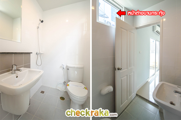 ห้องน้ำของบ้านเปล่าในมุมเดียวกัน ภายในห้องน้ำมีหน้าต่างบานกระทุ้งสำหรับเปิดระบายอากาศ 1 บาน