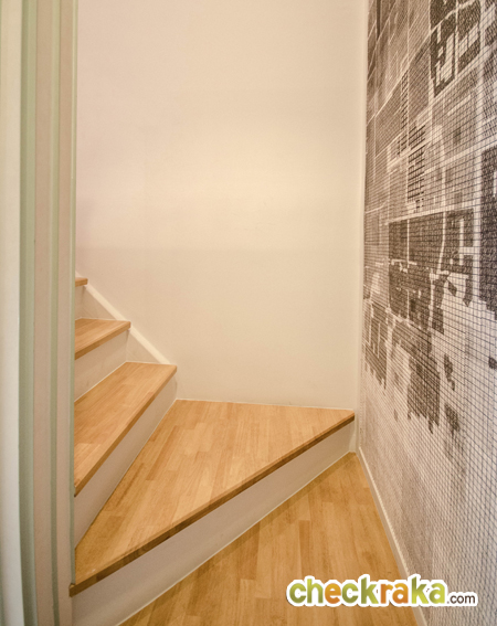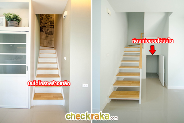 ข้างๆ บันไดทางขึ้นชั้น 2 คือห้องเก็บของใต้บันได ตัวบันไดที่นี่เป็นบันไดโครงสร้างเหล็ก พื้นบันไดไม้สำเร็จรูป