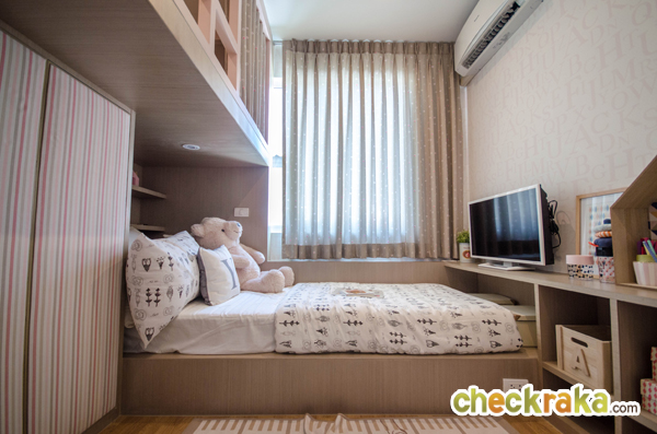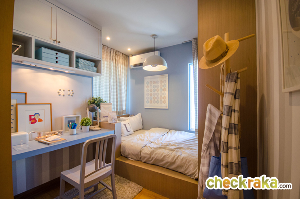 สามารถวางเตียงขนาด 3.5 ฟุต ตู้เสื้อผ้า และโต๊ะอ่านหนังสือได้พอดี ตรงหัวเตียงคือหน้าต่างบานเลื่อนที่