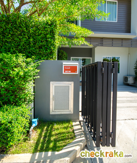 ในส่วนกำแพงหน้าบ้านติดตั้งถังขยะแบบฝังกำแพงมาให้ทุกหลัง เพื่อให้สะดวกการใช้งาน