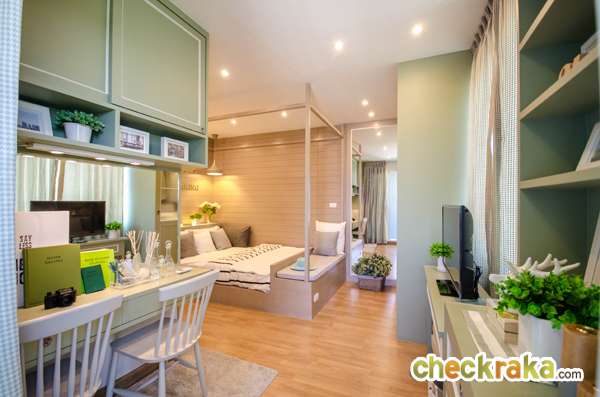พื้นที่ปลายเตียงจะจัดวางตู้เลื้อผ้า โต๊ะวางทีวี ชั้นวางของ และมีหน้าต่างบานเลื่อนเปิดระบายอากาศได้