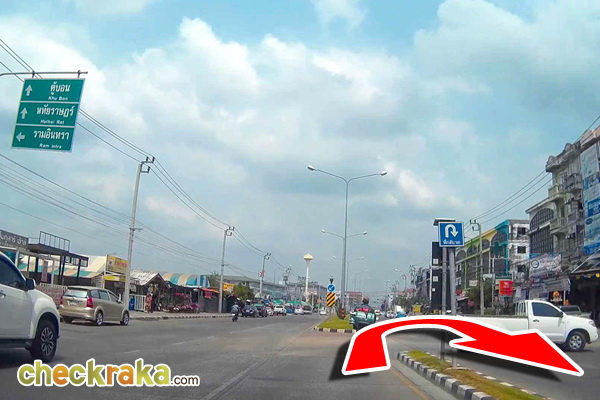 ตรงเข้าไปในถนนพระยาสุเรนทร์ ประมาณ 2.6 กม. จะผ่าน Tesco Lotus ให้เตรียมชิดขวาเพื่อกลับรถ
