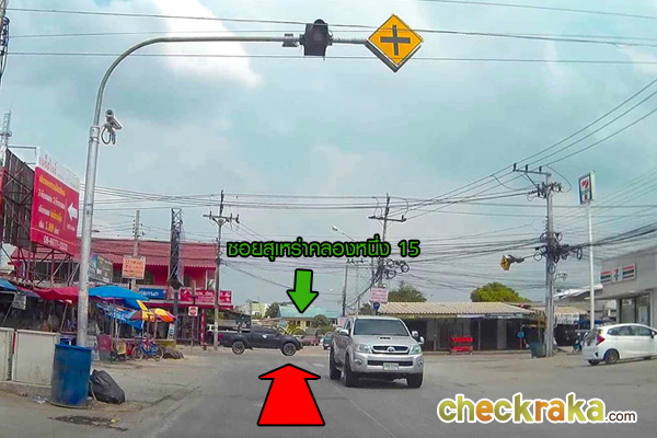 ขับตรงมาเรื่อยๆ จนถึงสี่แยก มีเซเว่นอยู่ด้านขวามือ ให้ตรงไปเพื่อเข้าถนนสุเหร่าคลองหนึ่ง (ซอย 15)