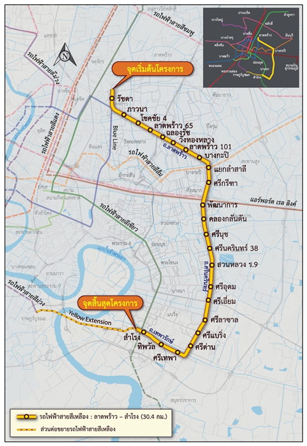 มีแนวเส้นทางอยู่ด้านตะวันออกของกรุงเทพมหานคร โดยเริ่มต้นจากปากทางถนนลาดพร้าว วิ่งไปจนถึงด้านหน้าของแฮปปี้แลนด์ จากนั้นก็จะวิ่งไปต่อบนถนนศรีนครินทร์จนถึงปลายทางย่านสำโรงในจังหวัดสมุทรปราการ