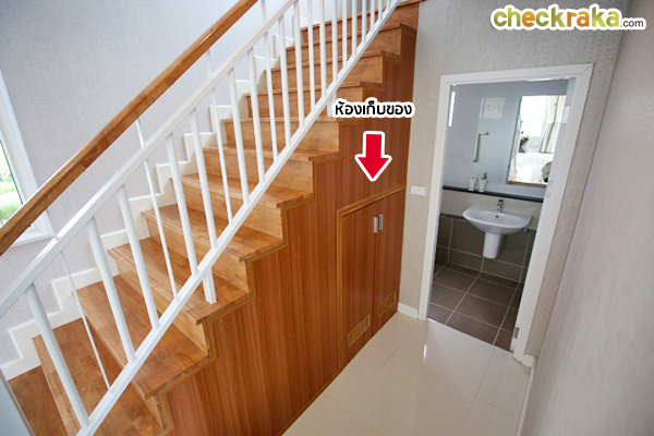 กลับมาในบ้านอีกครั้งค่ะ ห้องน้ำชั้นล่างจะอยู่ใต้บันไดพอดี มีห้องเก็บของเล็กๆ ซ่อนอยู่ด้วย