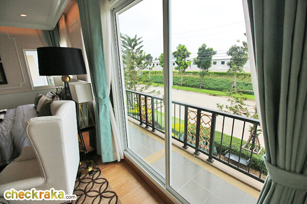ระเบียงยาวเหมือนแบบบ้าน PRIMO ค่ะ ส่วนประตูเป็นกระจกเขียวตัดแสง กรอบอลูมิเนียมสีขาว