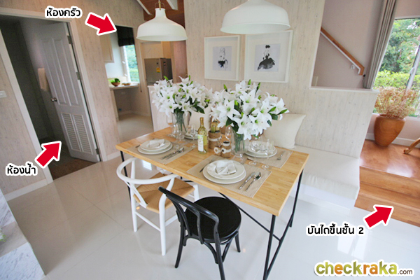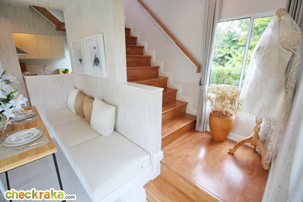 บ้านตัวอย่างเป็นโต๊ะรับประทานหารอาหารแบบ 4 ที่นั่งค่ะ เก้าอี้อีกมุม Built-in เก๋ๆ ช่วยพรางสายตาบริเวณบันไดได้