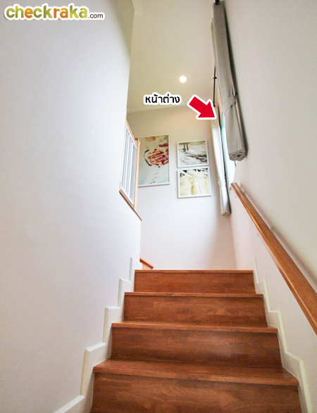 บันไดเป็นไม้สำเร็จรูปค่ะ เดินขึ้นมาตรงกลางมีชานพัก และหน้าต่างรับแสงอีกจุด ตอนกลางวันแทบไม่ต้องเปิดไฟ