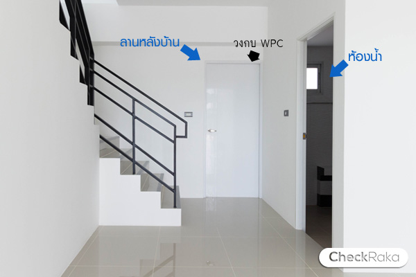ห้องน้ำอยู่ตรงข้ามกับบันได และมีประตูหลังบ้านไปลานซักล้างได้