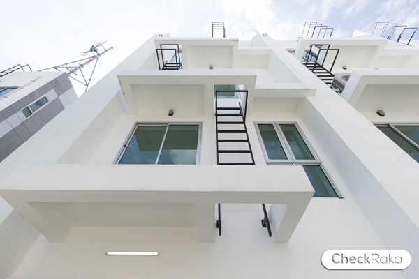 มุมมองจากหลังบ้าน มองขึ้นไปยังชั้นบน จะเห็นว่ามีชานพักและบันไดหนีไฟให้ทุกชั้น โดยติดตั้งหลอดไฟให้ด้วย