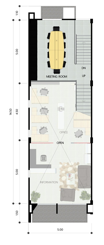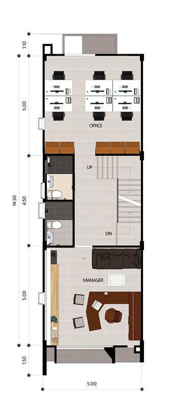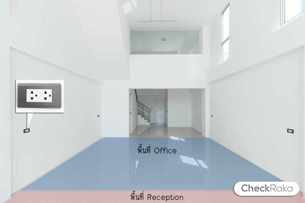 ดูแปลนบ้านชั้น 1 จะเห็นว่า ฟังก์ชั่นชั้นแรกนั้นจะประกอบไปด้วย ส่วนต้อนรับลูกค้า ถัดไปเป็นพื้นที่ทำงาน