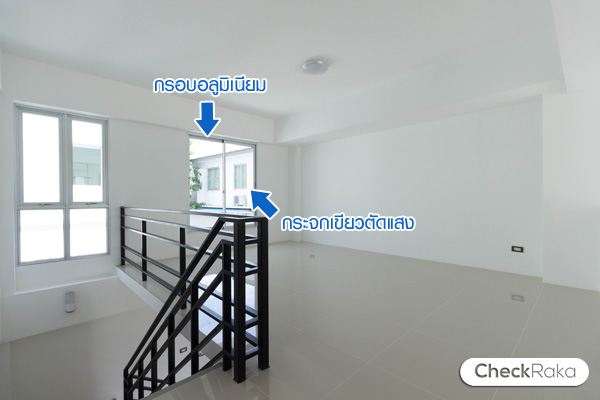 กรอบอลูมิเนียมสีธรรมชาติพร้อมกระจกเขียวตัดแสง ส่วนด้านข้างนั้นจะมีตู้เก็บของให้