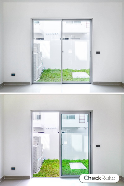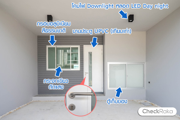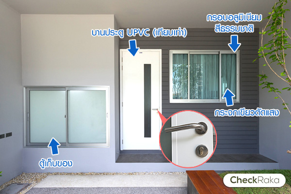 ส่วนประตูทางเข้าบ้านบานประตู UPVC หรือเทียบเท่า หน้าต่างด้านข้างเป็นบานเลื่อน