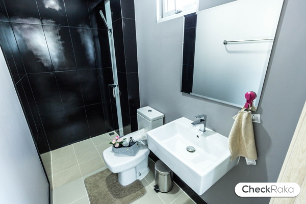 ห้องน้ำบริเวณห้องโถงออกแบบสไตล์โมเดิร์น สำหรับชั้นนี้จะมีส่วนเปียกสำหรับอาบน้ำให้ด้วยค่ะ