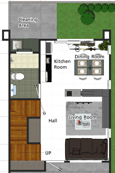 ด้านในสุดเป็นพื้นที่ทำห้องครัวเล็กๆ มีห้องเก็บของอยู่ใต้บันได