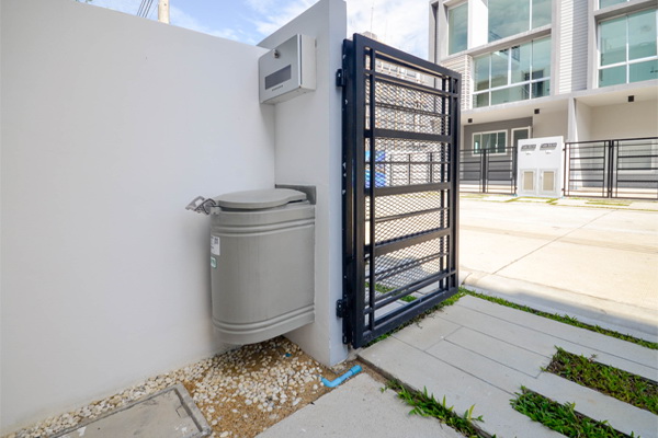 หน้าบ้านของบ้านเปล่า มีรั้วรอบขอบชิดให้เรียบร้อย ด้านข้างมีช่องถังขยะ และตู้รับจดหมายให้