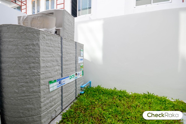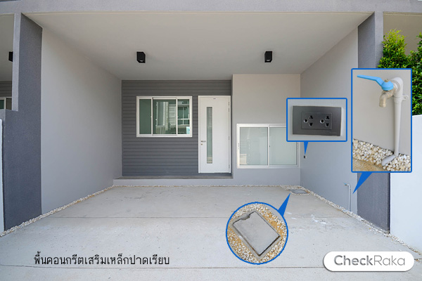 มีช่องระบายน้ำ รูเสียบเปลั๊กไฟ และก๊อกน้ำให้ตรงด้านข้างบ้าน