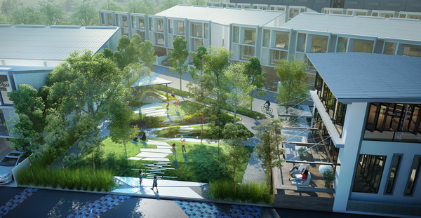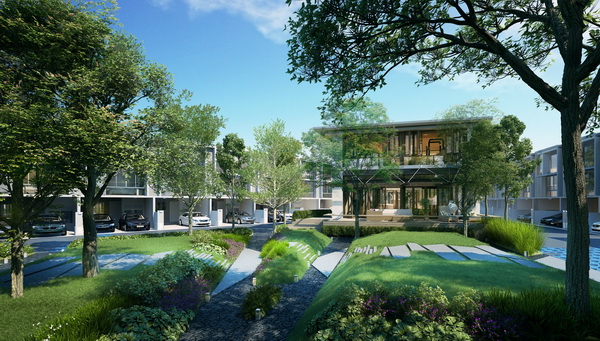 ภาพจำลองบรรยากาศบริเวณคลับเฮ้าส์ และสวนสาธารณะที่ออกแบบให้มีทางเดินต่างระดับ Dynamic Form