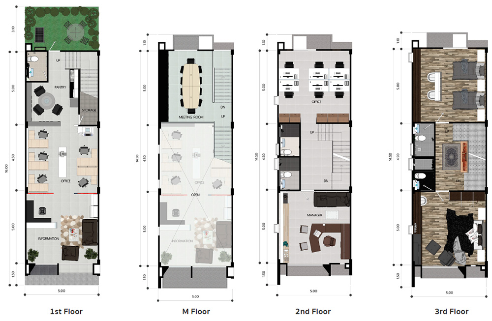 2. โฮมออฟฟิศ 3.5 ชั้น เนื้อที่บ้านเริ่มต้น 23.6 ตารางวา พื้นที่ใช้สอยเริ่มต้น 347 ตารางเมตร ประกอบไปด้วย โซนรับแขก, โซนทำงาน, ห้องประชุม, ห้องผู้บริหาร, 2 ห้องนอน, 5 ห้องน้ำ มีชั้นลอยและชั้นดาดฟ้า