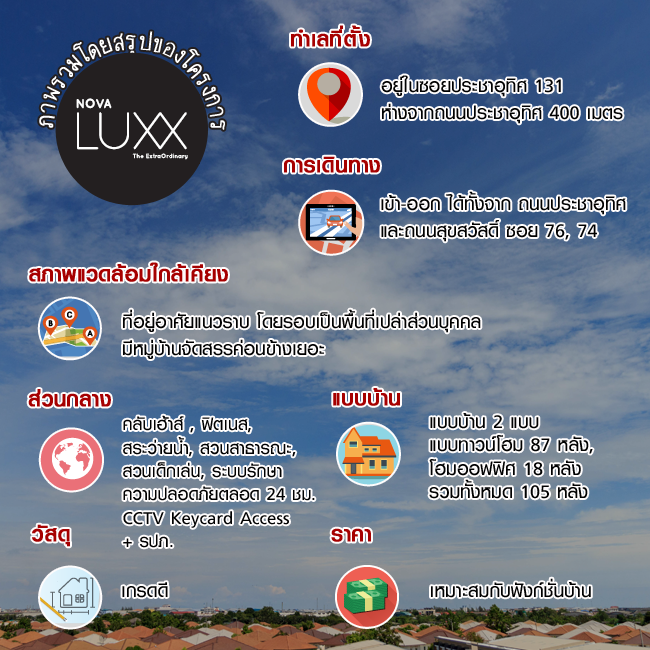โนวา ลักซ์ ประชาอุทิศ 131 จาก ธัญอนันต์ เดเวลลอปเม้นท์ ทาวน์โฮมที่มาพร้อมคอนเซ็ปต์ "The Extraordinary" ดีไซน์เพื่อสร้างความแตกต่าง ตัวโครงการเป็นทาวน์โฮม 2 ชั้น และโฮมออฟฟิศ 3.5 ชั้น ซึ่งเราได้พาไปเยี่ยมชมทั้งสองแบบ โดยตัวทาวน์โฮมนั้นมีความโดดเด่นในเรื่องของ Triple Space Double Volume หรือ ทาวน์โฮมในอารมณ์ 3 ชั้นในรูปแบบทาวน์โฮม 2 ชั้น ด้วยการดีไซน์ให้มี Double Volume บนชั้นสองด้วยการยกเพดานสูงจากพื้นถึง 5.15 เมตรเลยทีเดียว นับว่าเป็นความแปลกใหม่ที่น่าสนใจ และจะยังมีอะไรที่น่าติดตามอีกบ้างนั้น ตามไปชมกันต่อเลยค่ะ