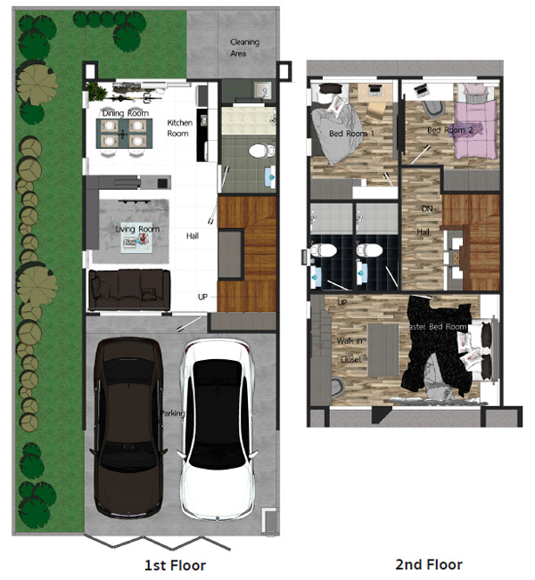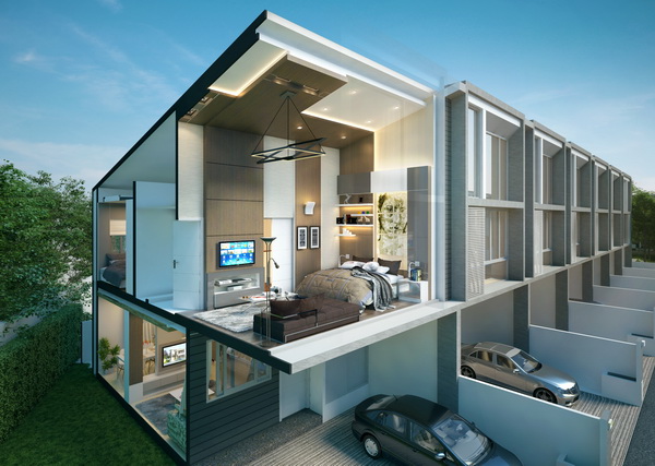 1. ทาวน์โฮม 2 ชั้น เนื้อที่บ้านเริ่มต้น 20.6 - 61 ตารางวา พื้นที่ใช้สอย แบบบ้านที่ไม่มีชั้นลอย 126 ตารางเมตร แบบบ้านที่มีชั้นลอย 137 ตารางเมตร หน้ากว้าง 5.5 เมตร จอดรถได้ 2 คัน ประกอบไปด้วย 3 ห้องนอน 3 ห้องน้ำ