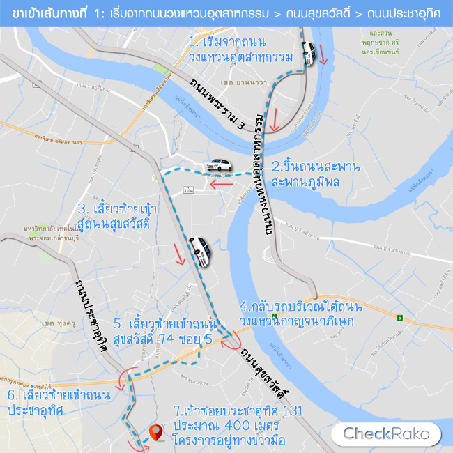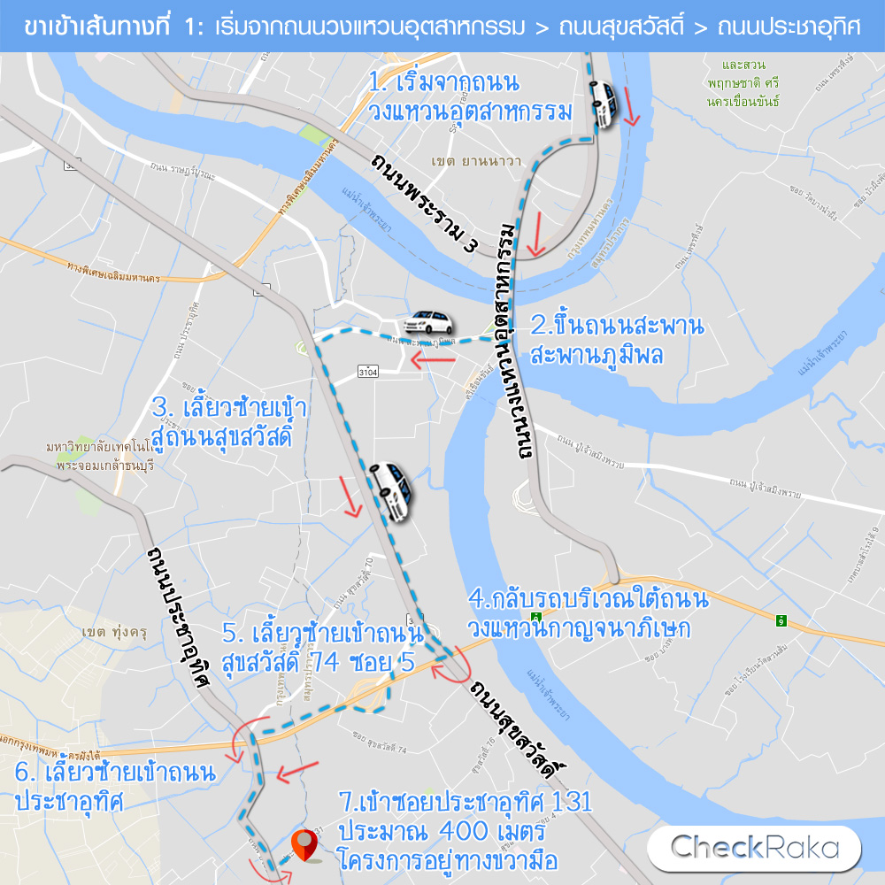 ขาเข้าโครงการ เส้นทางที่ 1 มาจากถนนสุขสวัสดิ์ เข้าซอยประชาอุทิศ 131