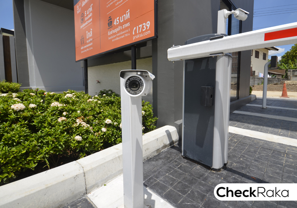 ที่ซุ้มประตูทางเข้ามีทั้ง รปภ. อำนวยความสะดวก การ์ดสแกน, ไม้กั้นกระดก, และ CCTV (ที่ประตูทางเข้ามีกล้อง 2