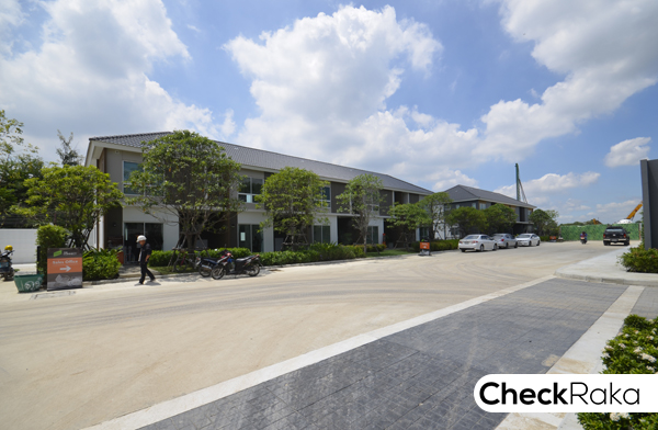ผ่านประตูโครงการเข้ามา จะมองเห็นบ้านตัวอย่างและ Sales Office ตรงที่มีรถจอดอยู่นั่นเลยค่ะ สวนส่วนกลางและ