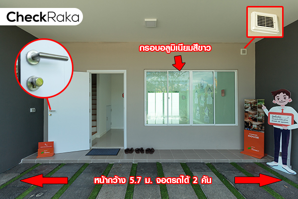 แบบบ้านภายในโครงการที่เราจะพาทุกท่านมาเยี่ยมชม-รีวิวในวันนี้ คือ แบบบ้าน 2 จอดรถ ซึ่งเป็นทาวน์โฮม 2 ชั้น หน้ากว้าง 5.7 เมตร ที่ดินเริ่มต้น 21.4 ตร.ว. พื้นที่ใช้สอยประมาณ 109.72 ตร.ม. ขนาด 3 ห้องนอน 2 ห้องน้ำ จอดรถ 2 คัน ที่จริงแล้ว โครงการนี้มีแบบบ้าน 2 แบบนะคะ แต่ทั้งสองแบบมีฟังก์ชั่นที่คล้ายกัน เพราะฉะนั้นเราจึงขอพาท่านไปเยี่ยมชมบ้านที่มีขนาด 2 ที่จอดรถ ซึ่งเป็นบ้านตัวอย่างพร้อมตกแต่ง และบ้านเปล่ามาตรฐานที่ใช้ส่งมอบลูกค้ามาให้ชมกันค่ะ